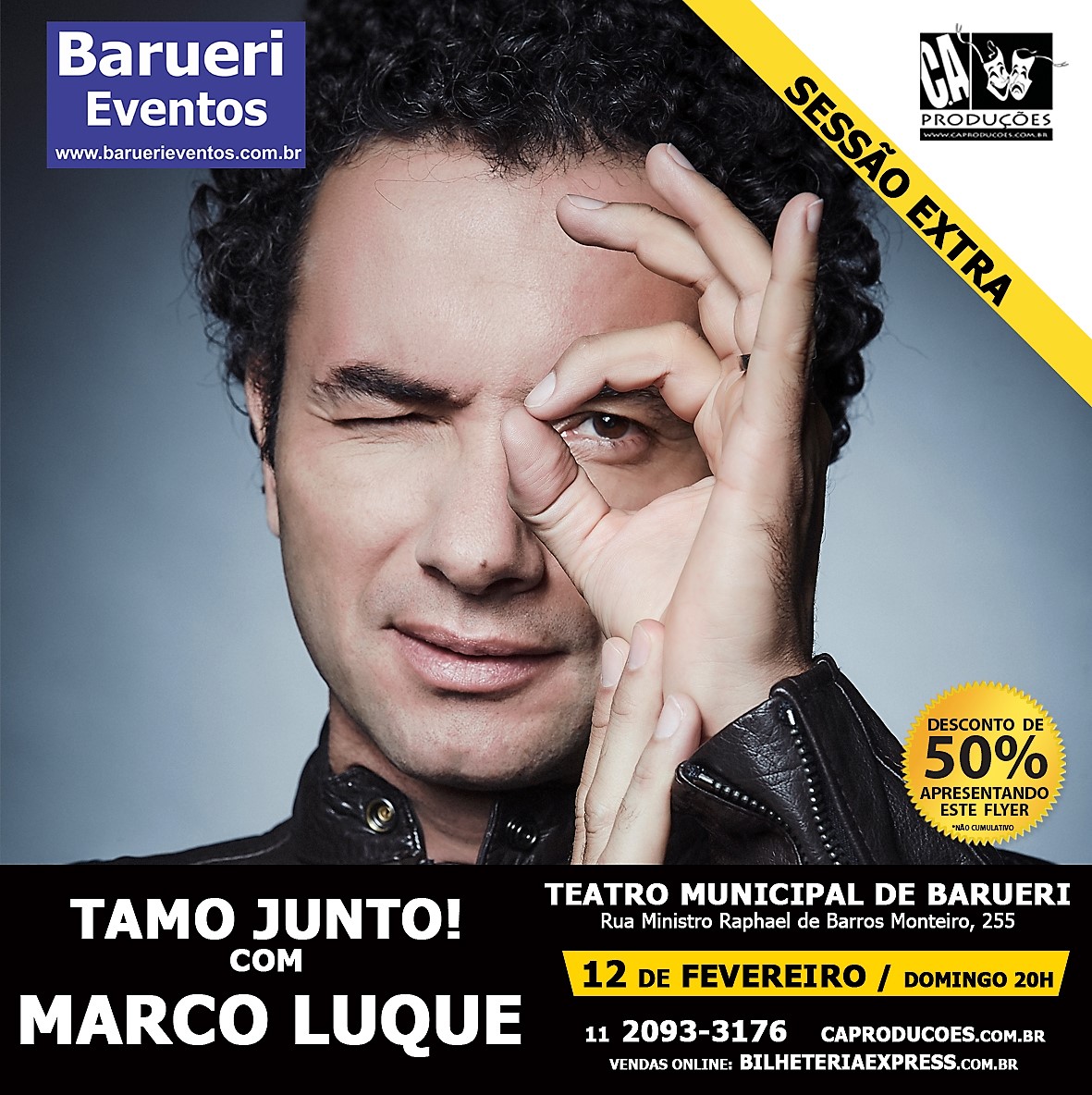 No próximo dia 12 de fevereiro, domingo, às 18h, o artista Marco Luque apresentará o stand up comedy “Tamo Junto!” no Teatro Municipal de Barueri, localizado na Rua Ministro Raphael de Barros Monteiro, 255, na Vila Boa Vista, em Barueri, São Paulo.