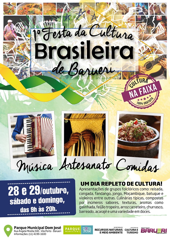 No próximo fim de semana (dias 28 e 29), o Parque Municipal Dom José vai se encher de brasilidade com a Festa da Cultura Brasileira de Barueri. Serão diversas manifestações artísticas representando a riqueza cultural do país, com entrada totalmente gratuita.
