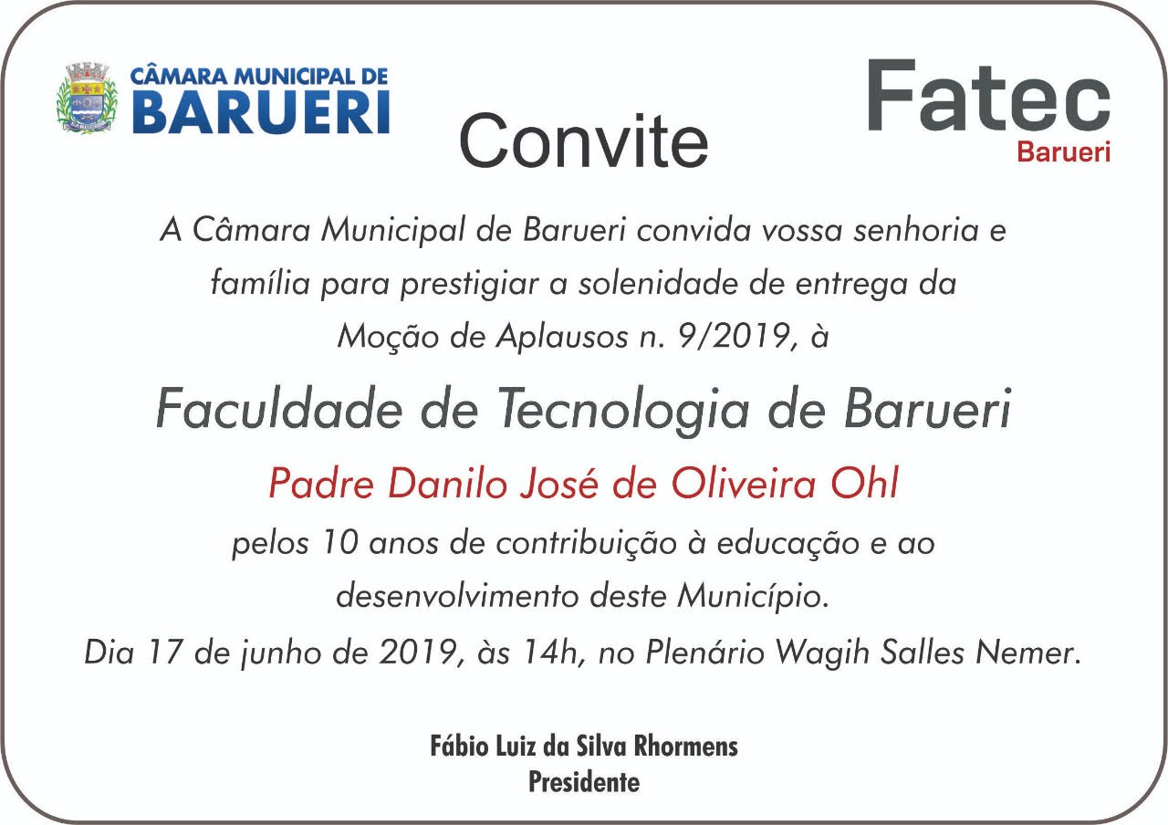 O Presidente da Câmara Municipal de Barueri Fabio Luiz da Silva Rhormens, convida para a solenidade de entrega da Moção de Aplausos à nossa Fatec Barueri (Moção n. 09/2019), pelos 10 anos de contribuição à educação e ao desenvolvimento do Município, que ocorrerá no dia 17 de junho de 2019 (segunda-feira), às 14h, no Plenário Wagih Salles Nemer.
