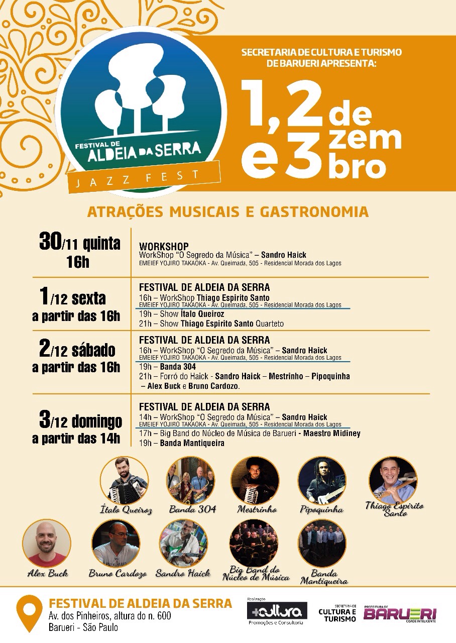 O jazz tomará conta de Barueri. Nos dias 1, 2 e 3 de dezembro (sexta a domingo) acontecerá o Festival de Aldeia da Serra. A cidade receberá grandes músicos como o baixista Thiago Espírito Santo, Sandro Haick, Banda Mantiqueira, Alex Buck e a revelação Mestrinho e seu acordeom, entre outros. Além de atrações musicais haverá também gastronomia e workshops. O endereço é avenida dos Pinheiros, altura do n. 600, Aldeia da Serra.