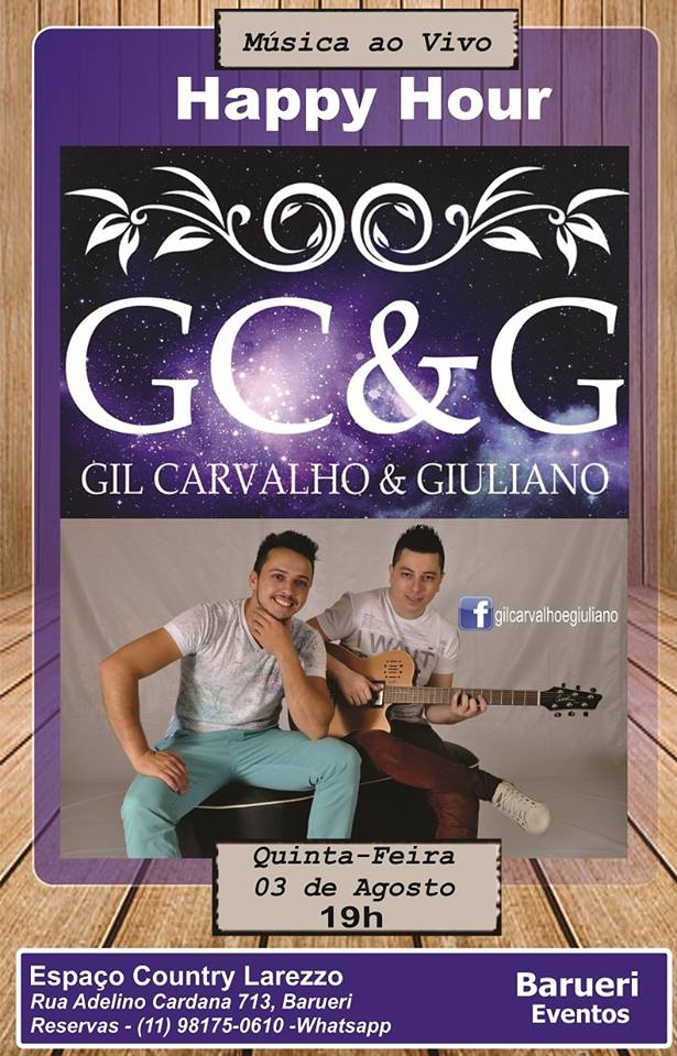 Nesta quinta tem música sertaneja de qualidade no espaço Country Larezzo em Barueri com a dupla Gil Carvalho & Giuliano com grandes sucessos sertanejos, venha e traga sua família e amigos.