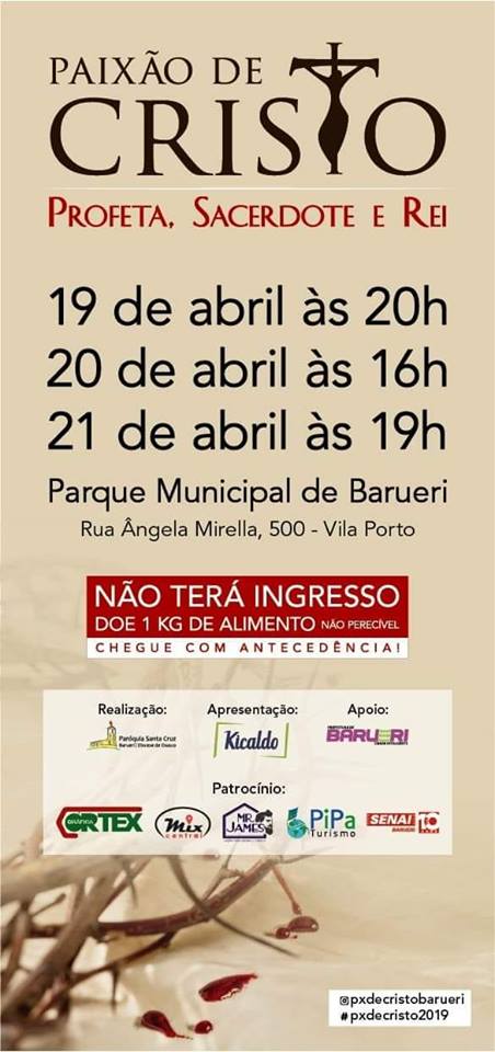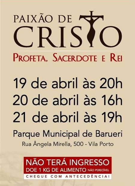 O consagrado espetáculo da “Paixão de Cristo” mais uma vez aconteceu no Parque Municipal “Dom José”, em Barueri, Neste ano, a encenação que representa episódios da vida de Jesus Cristo, conforme relato da Bíblia, tem como tema “Profeta, Sacerdote e Rei”.