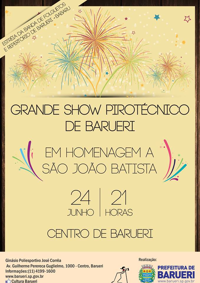 Já é tradição em Barueri celebrar o Dia de São João Batista, padroeiro da cidade, com um show pirotécnico envolvendo muitas cores e brilho. Comemorado no dia 24 de junho, os festejos serão realizados a partir das 19h30 na Praça dos Estudantes, na Avenida Guilherme Guglielmo, e a queima de fogos acontecerá às 21h.
